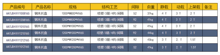 四向三腿——鋼木托盤(pán) 技術(shù)參數(shù)說(shuō)明: 產(chǎn)品編號(hào): AATJD4ⅢY1212165 產(chǎn)品規(guī)格: 1200*1200*165 產(chǎn)品自重: 45kg 防銹工藝: 靜電沙紋噴塑 產(chǎn)品靜載: 3000KG(均勻載重) 產(chǎn)品動(dòng)載: 2500KG(均勻載重) 產(chǎn)品上架: 1500KG(均勻載重) 主要用途: 倉(cāng)庫(kù)、車(chē)間周轉(zhuǎn)、高庫(kù)物流倉(cāng)儲(chǔ)