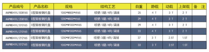 四向三腿——C型面板鋼托盤 技術參數(shù)說明: 產(chǎn)品編號: AAPMD4ⅢL1210165 產(chǎn)品規(guī)格: 1200*1000*165 產(chǎn)品自重: 33kg 防銹工藝: 靜電沙紋噴塑 產(chǎn)品靜載: 3000KG(均勻載重) 產(chǎn)品動載: 2500KG(均勻載重) 產(chǎn)品上架: 1500KG(均勻載重) 主要用途: 倉庫、車間周轉(zhuǎn)、物流倉儲
